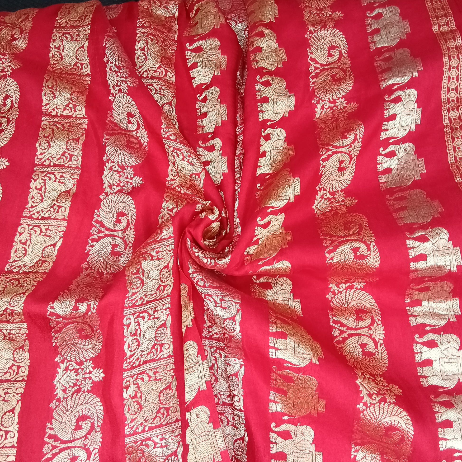 Design Detailing: This is a beautiful red Banarasi silk saree, a traditional Indian garment known for its rich texture and luxurious feel. It features intricate gold zari work with detailed elephant and paisley motifs, which are characteristic of Banarasi weaving traditions. These finely woven sarees are considered opulent and are often worn for significant occasions such as weddings and grand festivals.