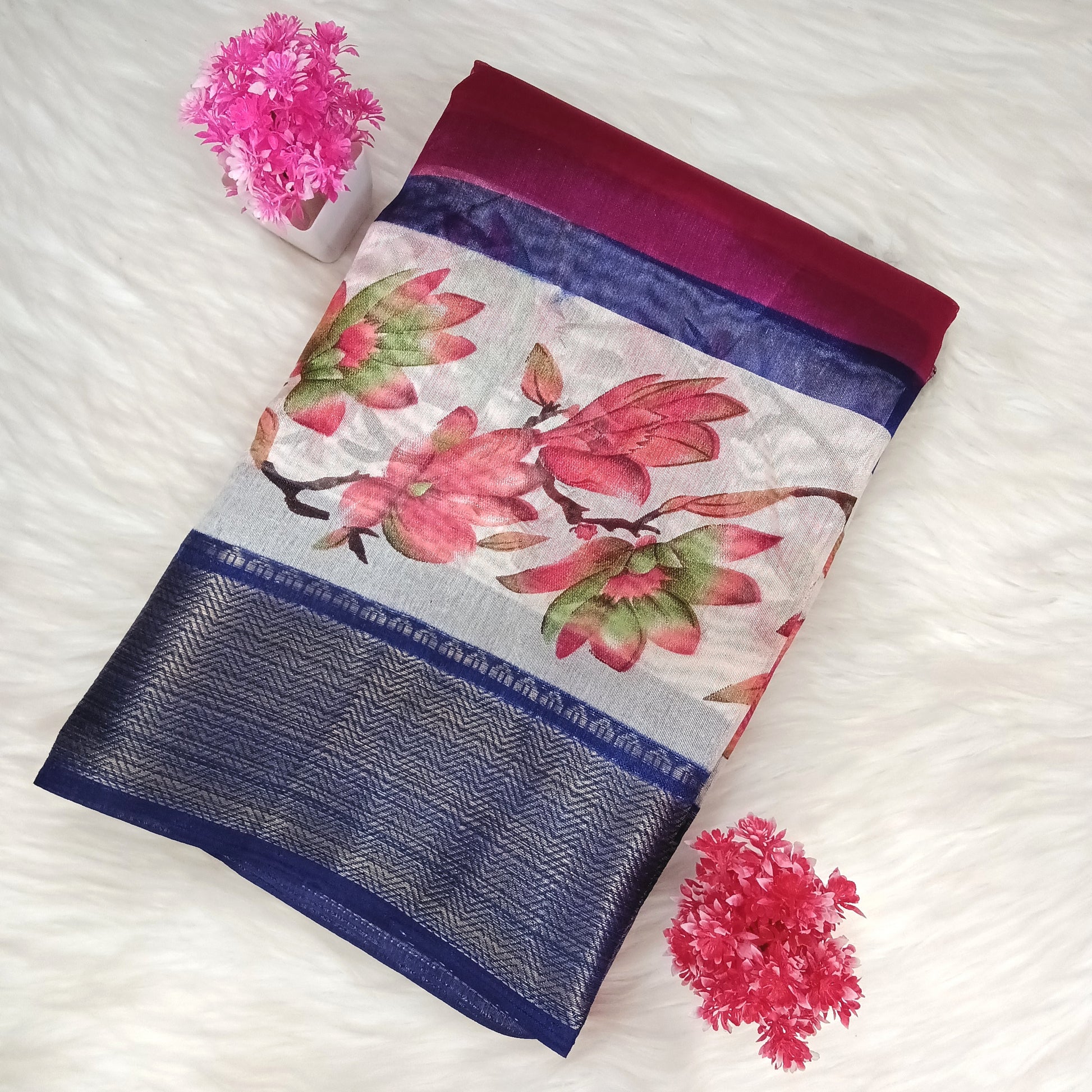 Design Detailing: This is a white and Dark Pink printed saree with a striking floral pattern. The body of the saree features large Green and Rose flowers on a light background. It has a prominent, shimmery dark color border with a distinct chevron design. A thin Silver edge frames the entire saree, adding a vibrant contrast to the overall look.