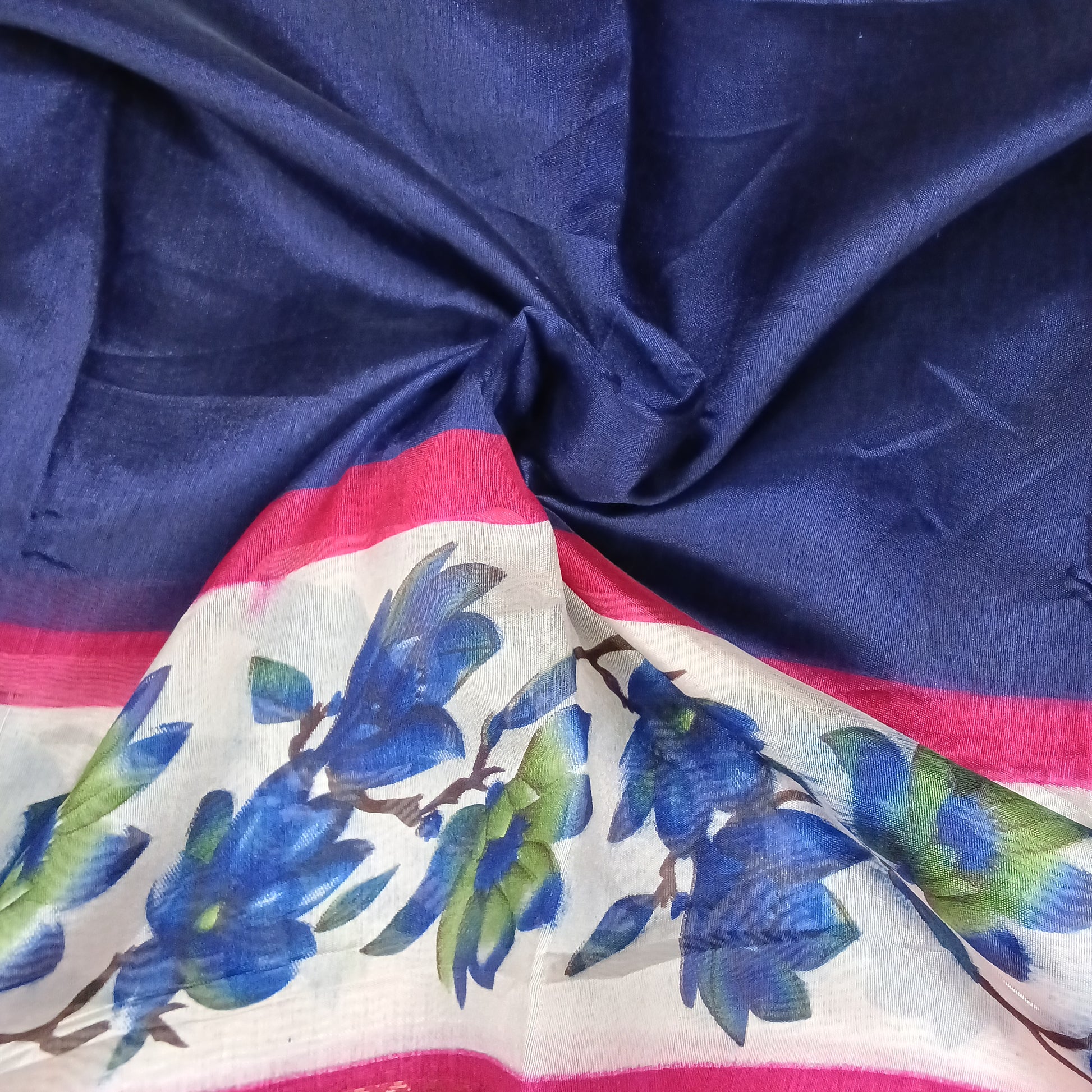 Design Detailing: This is a white and Light Blue printed saree with a striking floral pattern. The body of the saree features large Green and blueflowers on a light background. It has a prominent, shimmery dark color border with a distinct chevron design. A thin Silver edge frames the entire saree, adding a vibrant contrast to the overall look.