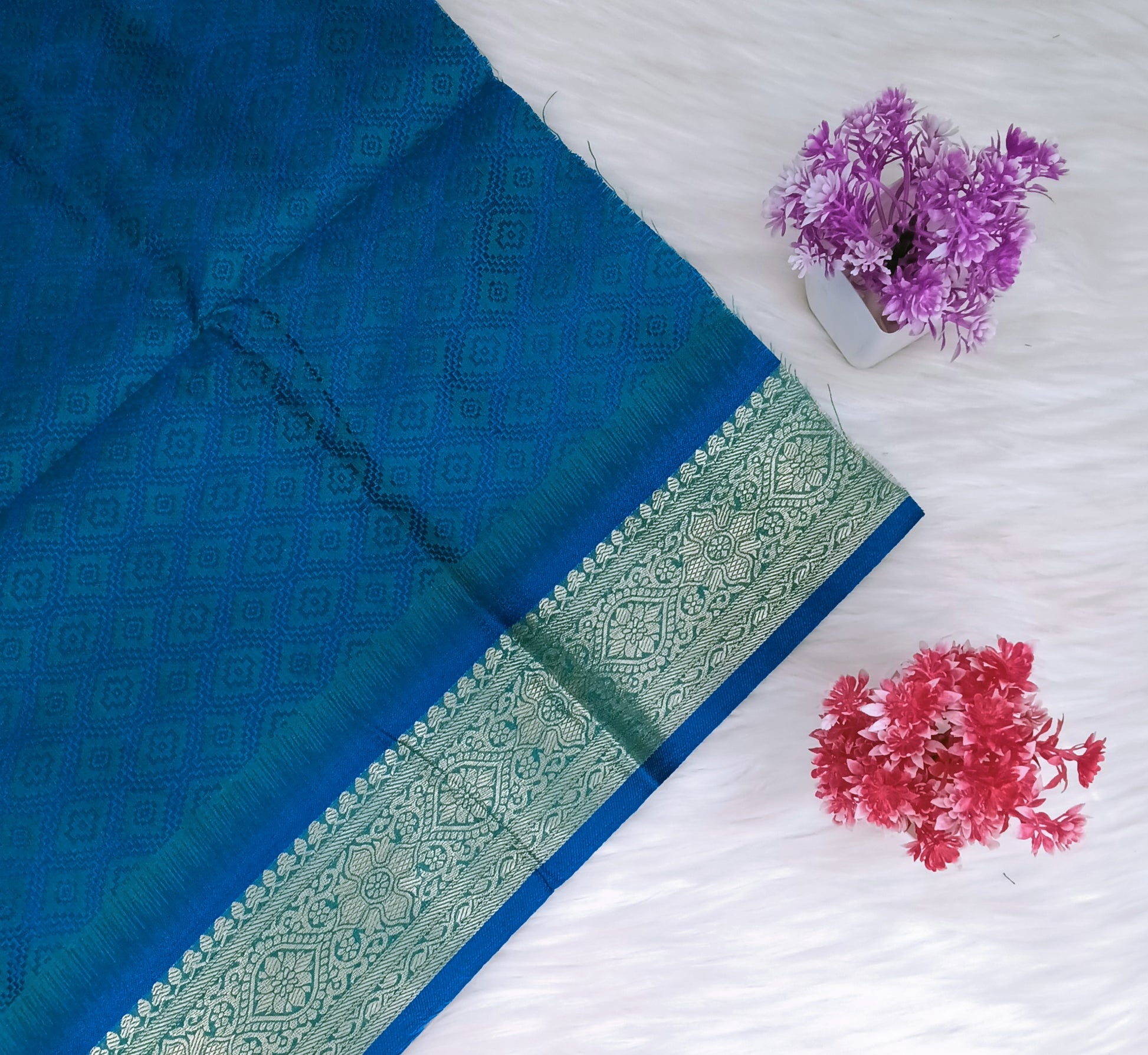 Design Detailing: The saree in the image is a red brocade silk saree, often identified as a Kanjivaram or Banarasi style. It features intricate traditional motifs like elephants and peacocks within circular patterns. Made from luxurious silk fabric, the rich Blue color symbolizes passion and vitality. This elegant and sophisticated piece is suitable for weddings and special events.