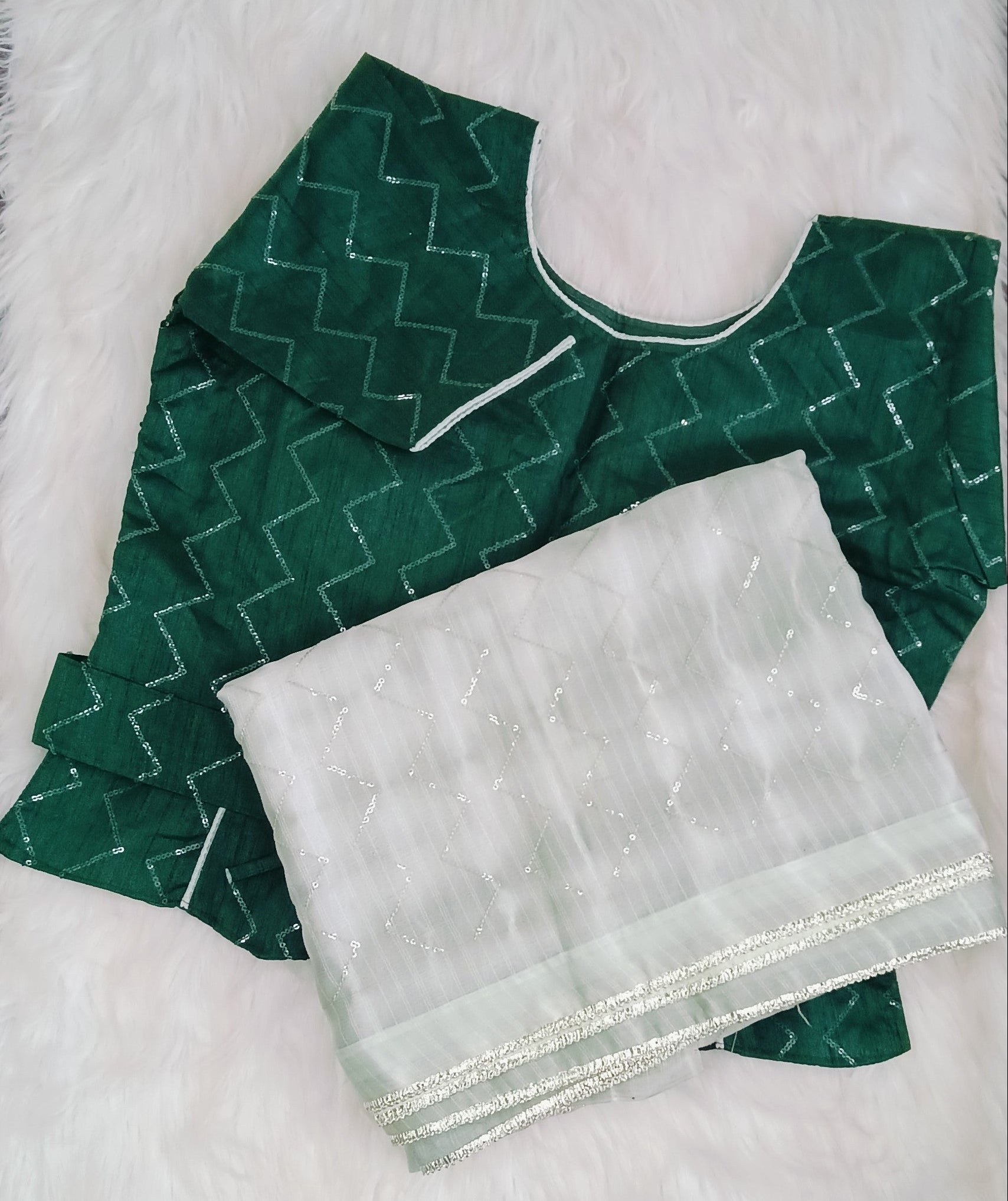 Design Detailing: This is a fancy saree and blouse set featuring a deep green blouse with a zig zag sequin pattern. The blouse has a simple round neck and is paired with a lightweight, sheer white saree. The saree is adorned with a silver border and delicate sequins, creating an elegant and festive look. The combination of the rich green blouse and the light, embellished saree is suitable for special occasions.