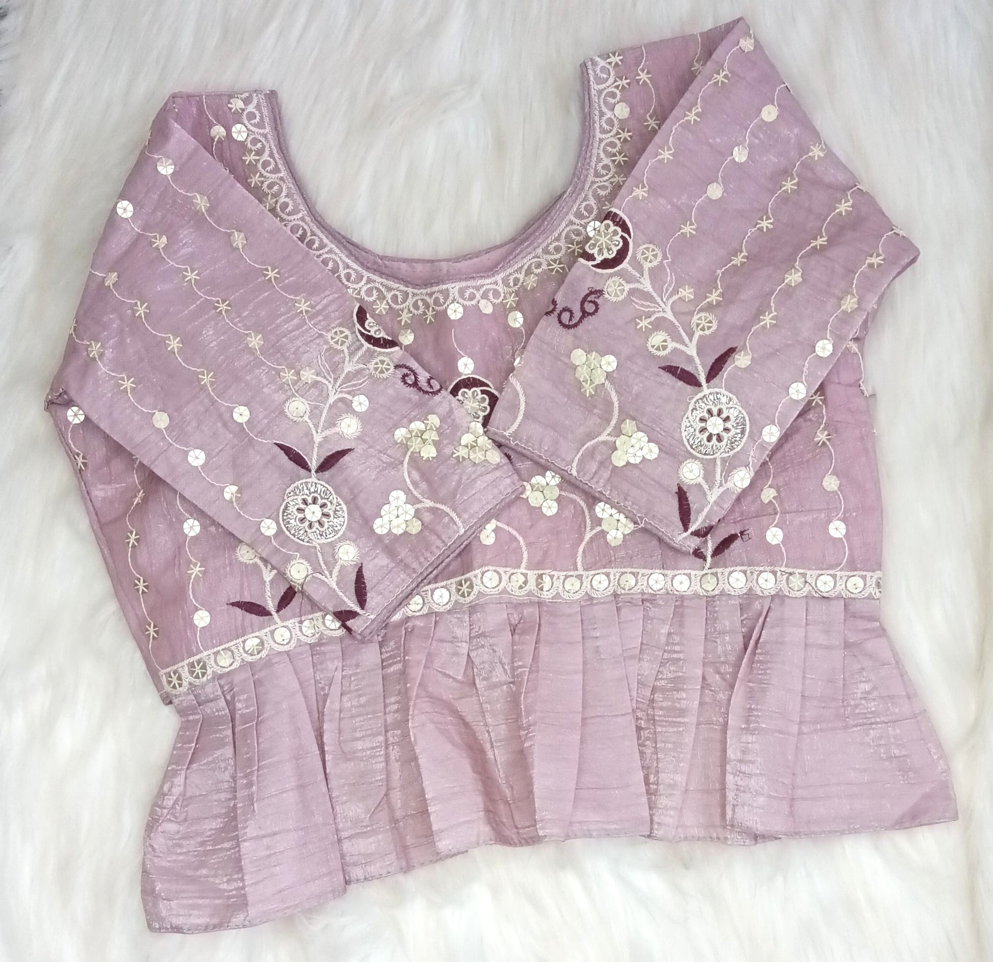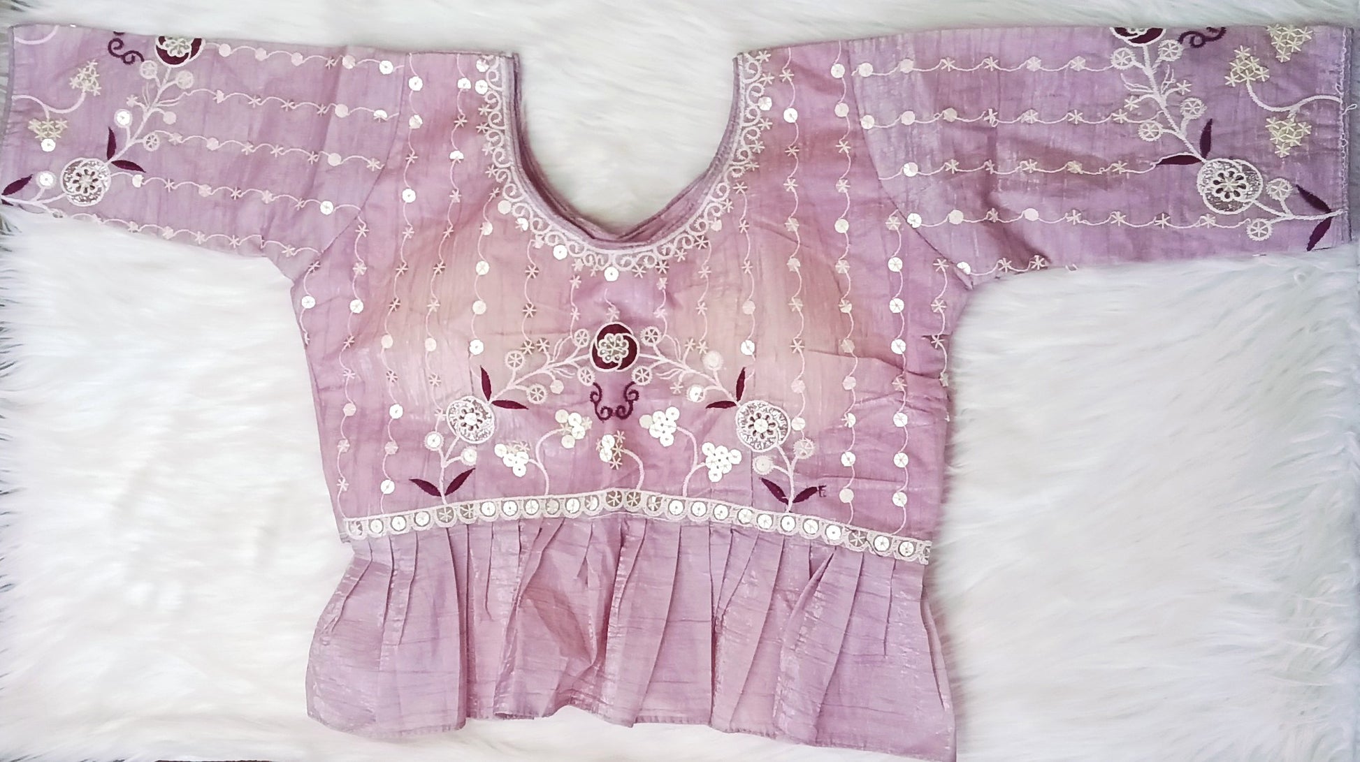 Design Detailing: This is a light blue saree and blouse set with intricate embroidery. The blouse features a round neck and full sleeves with a gathered cuff, giving them a bell shape. The fabric appears to be a lightweight, sheer material, possibly organza, with a subtle sheen. Both the blouse and the folded saree fabric are adorned with floral and leaf-like embroidery in shades of white, pink, and light blue.