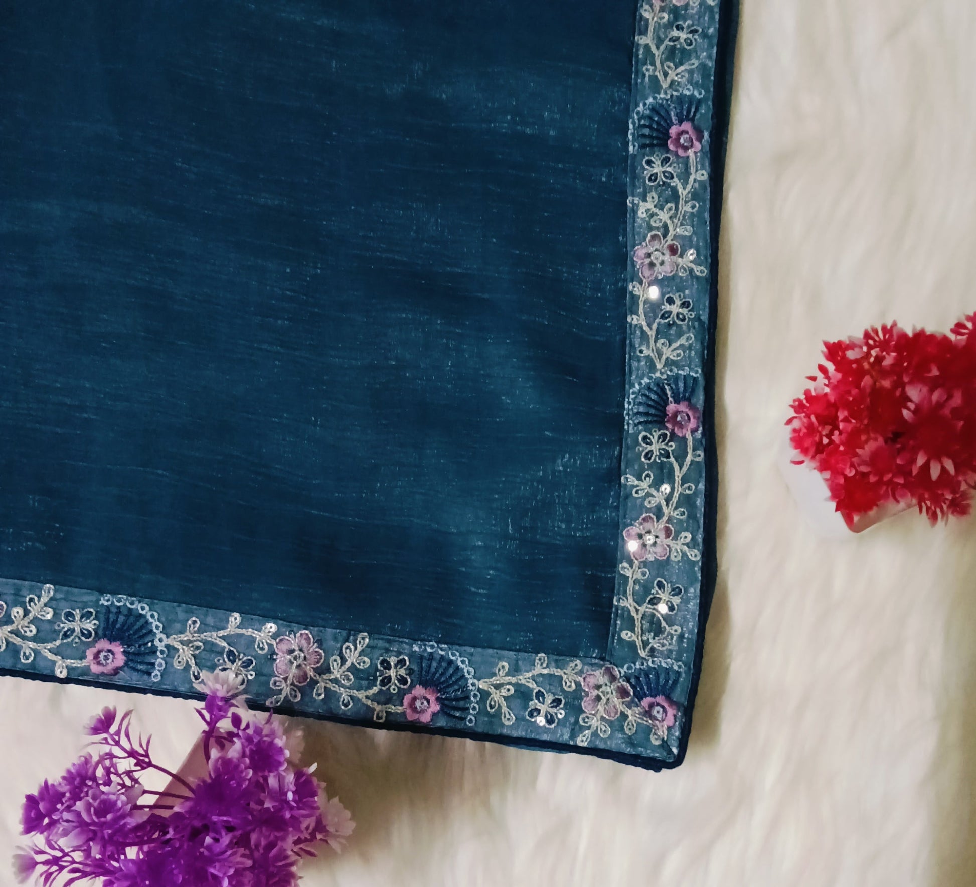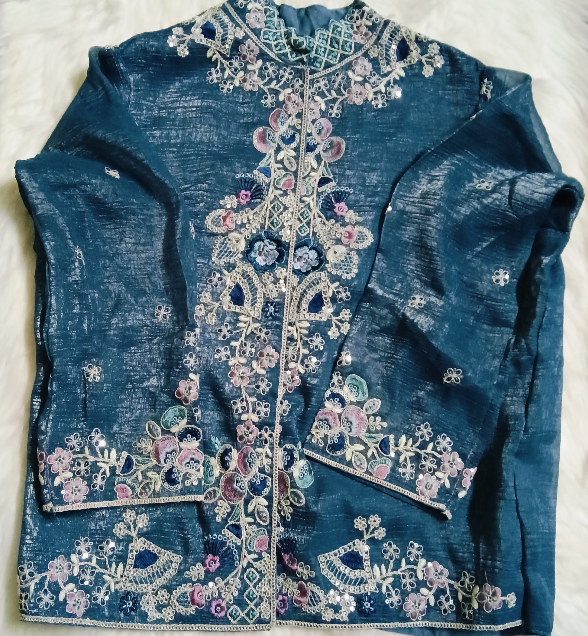 Design Detailing: This is a beautiful magenta-colored saree set featuring a crinkled tissue-like fabric. The saree is paired with a matching blouse. A long, open-front jacket or coat, also made of the same fabric, is draped over the blouse. The coat and the borders of the saree are adorned with intricate floral and geometric embroidery, featuring multi-colored threads, sequins, and stone work.
