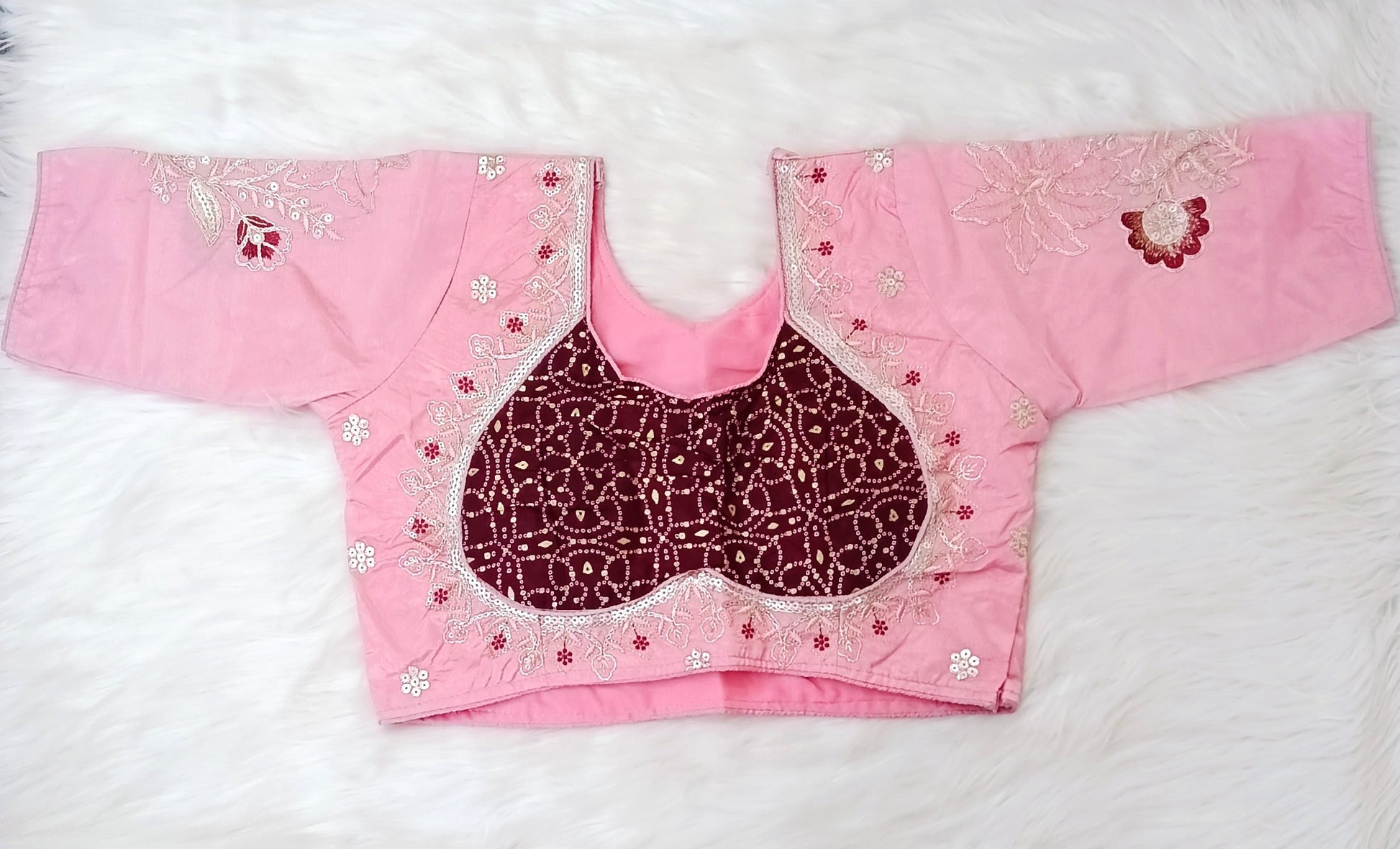 Design Detailing: The image displays a lovely pink saree and a matching blouse. The blouse features a contrasting maroon, heavily embellished back panel with delicate white and silver detailing. The light pink saree has a silver border with small red floral accents and a simple motif on the pallu area. This traditional attire presents an elegant and coordinated look.