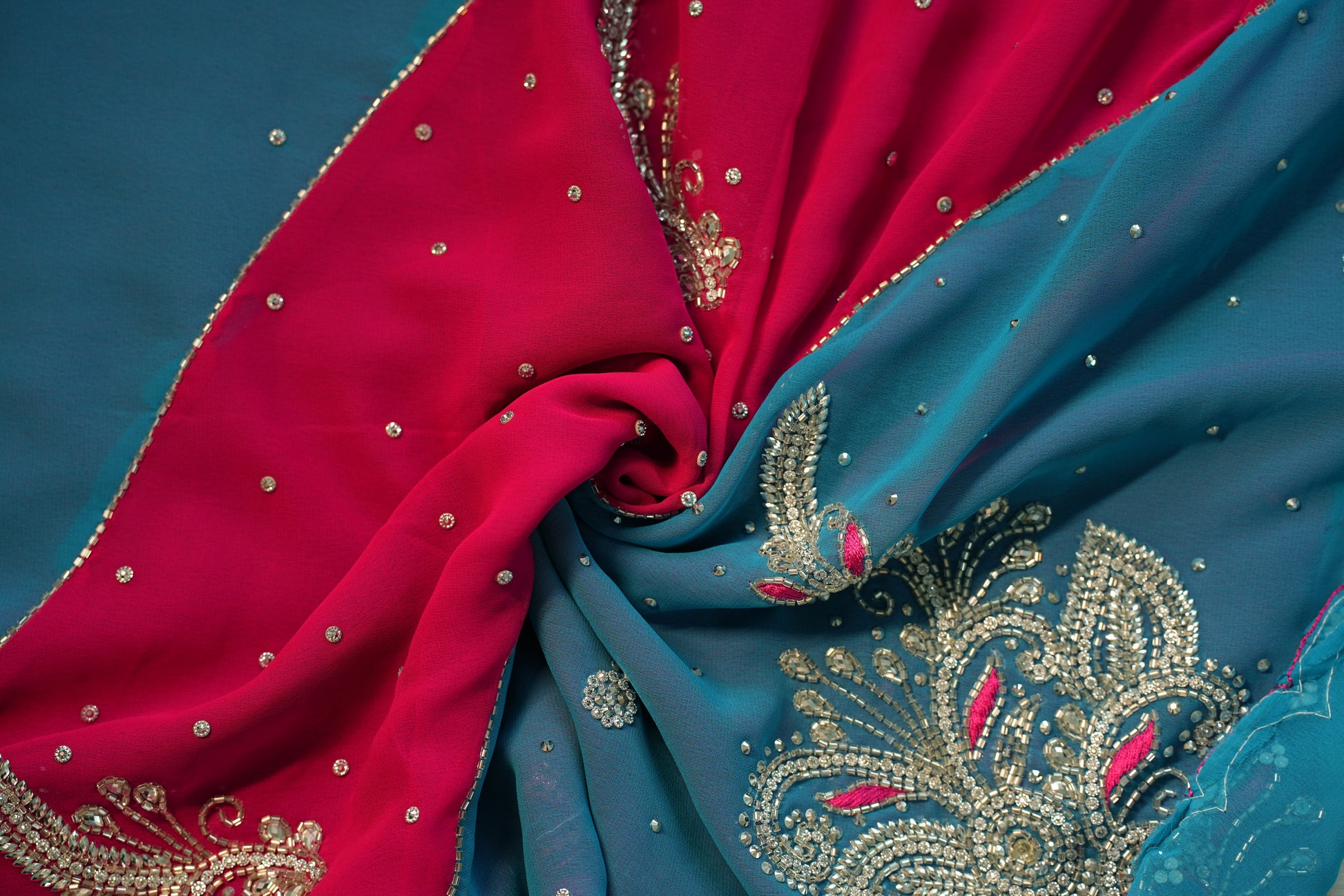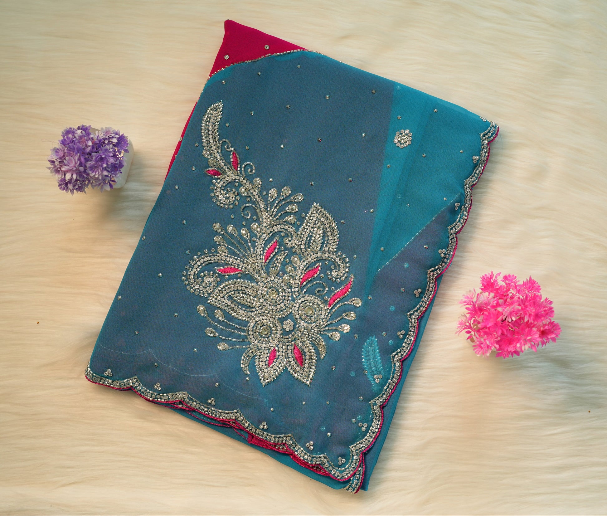 Design Detailing: This fancy stone saree features intricate stone work on a vibrant Color fabric. The elaborate floral design, embellished with shimmering stones, adorns a prominent section of the saree. It is edged with a matching border, highlighting the detailed craftsmanship.