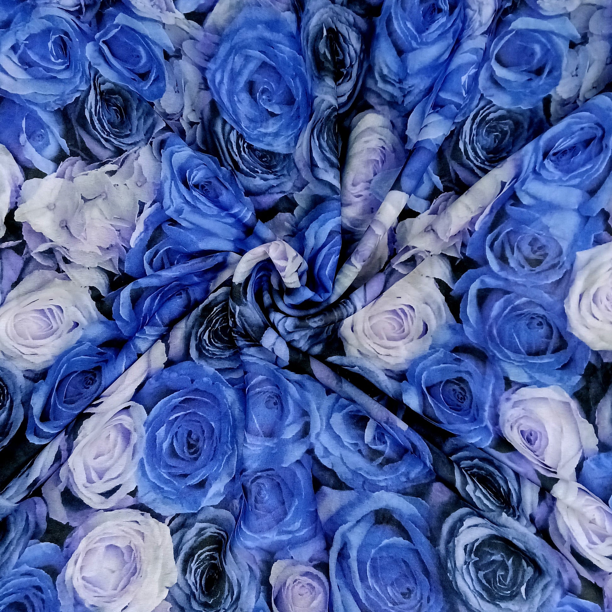 Design Detailing: The item in the image is a textile product, possibly a fabric for a coverup, wallpaper, or throw blanket, featuring a striking blue rose pattern. It has a soft, flowing appearance and a vibrant, detailed floral design in various shades of blue and white. The material could be a non-woven fabric, blockout fabric, or chiffon, depending on its intended use. The design style is modern and romantic, with a focus on the large, realistic rose motifs.