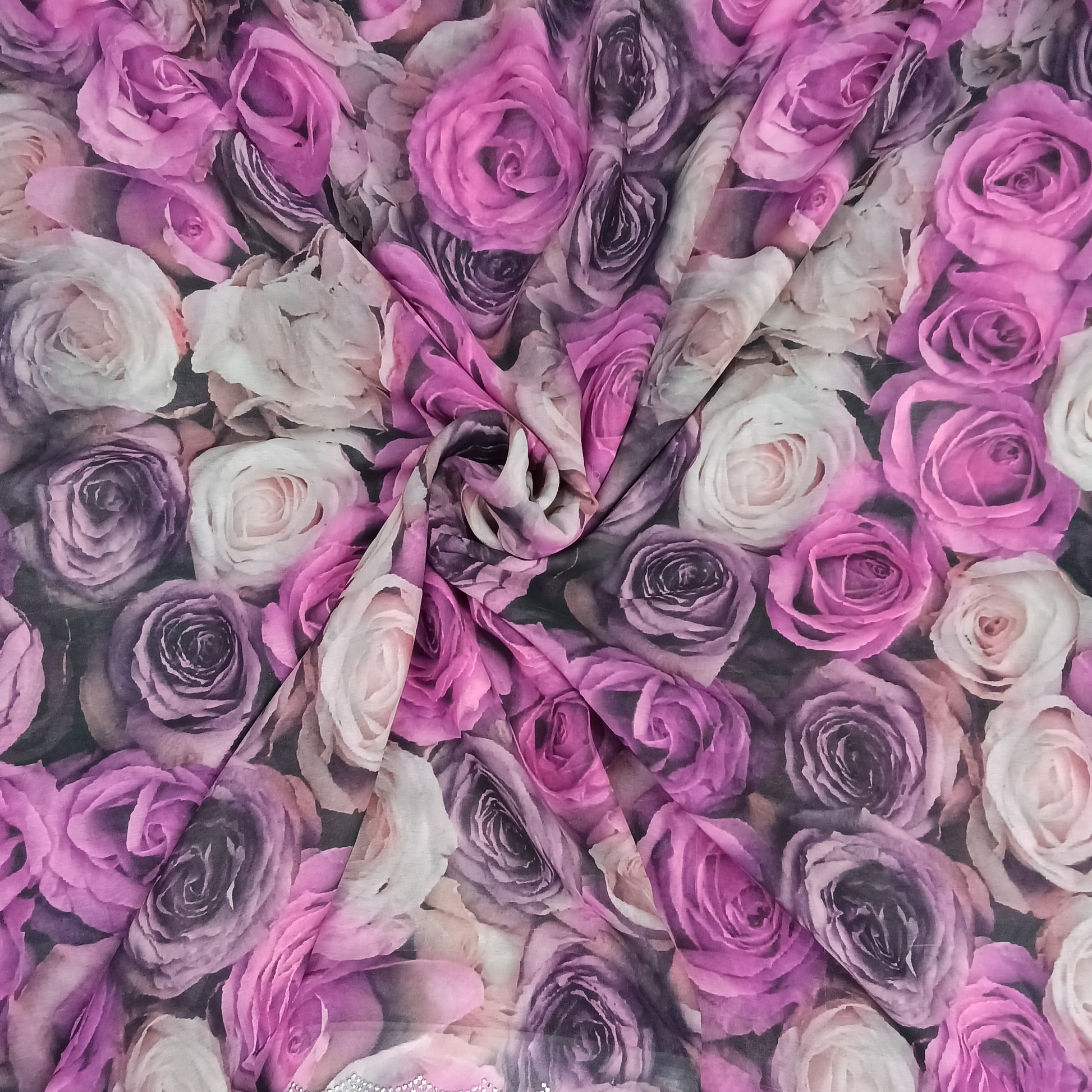 Design Detailing: The item in the image is a textile product, possibly a fabric for a coverup, wallpaper, or throw blanket, featuring a striking purple rose pattern. It has a soft, flowing appearance and a vibrant, detailed floral design in various shades of blue and white. The material could be a non-woven fabric, blockout fabric, or chiffon, depending on its intended use. The design style is modern and romantic, with a focus on the large, realistic rose motifs.