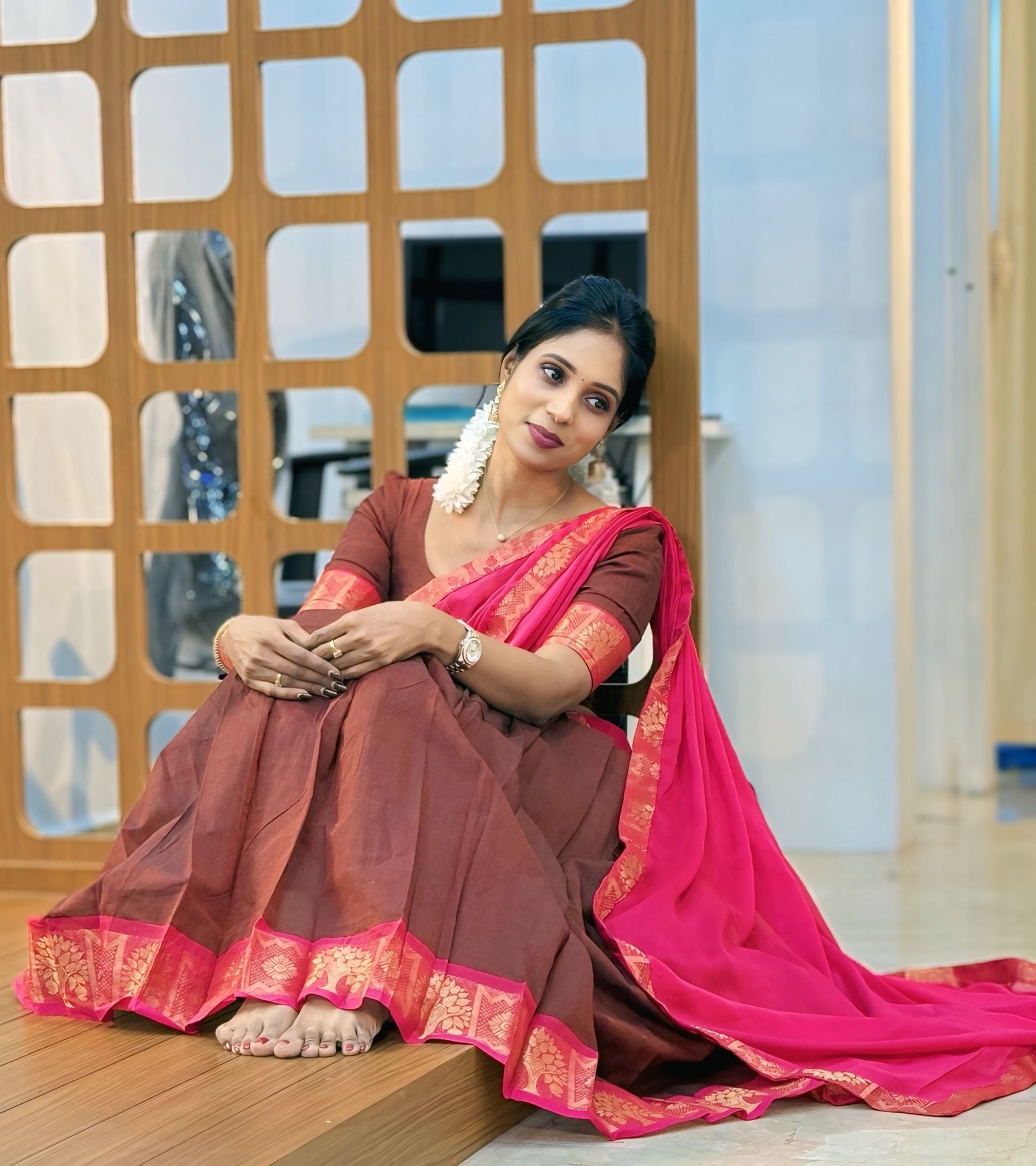 Design Detailing: A half saree is a traditional South Indian three-piece garment worn by young women, also known as Langa Voni or Pavadai Davani. It consists of a long skirt (pavadai), a blouse (choli), and a draped cloth (davani) worn over the shoulder. The outfit is often worn for festivals, weddings, and coming-of-age ceremonies, symbolizing a girl's transition into womanhood. The half saree in the image features a maroon skirt and blouse with a contrasting pink davani, all with a golden border.
