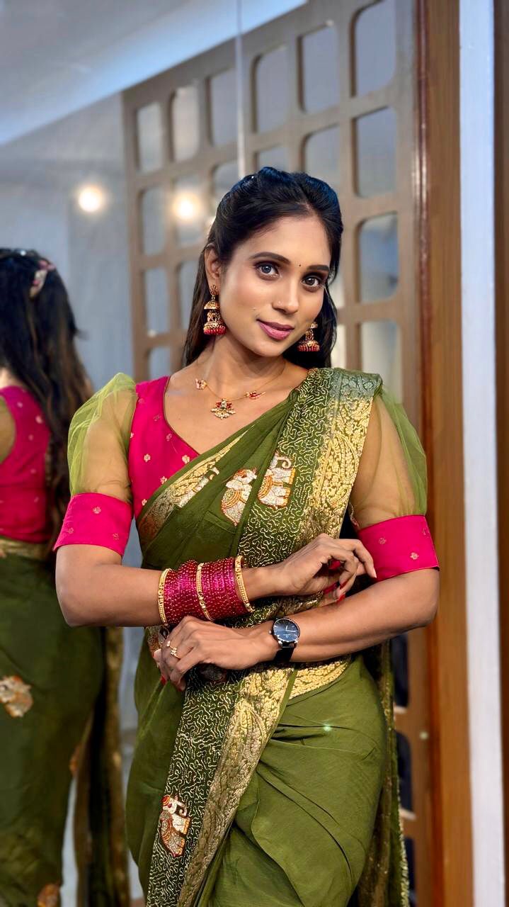 Design Detailing: The saree Elephant Premium Soft Viscose . It features gold and silver motifs, including distinct elephant designs on the body and border. The fabric is a soft material with an emboss pattern, designed to look like pure silk. The border has a rich, intricate design. Only M-Size Available