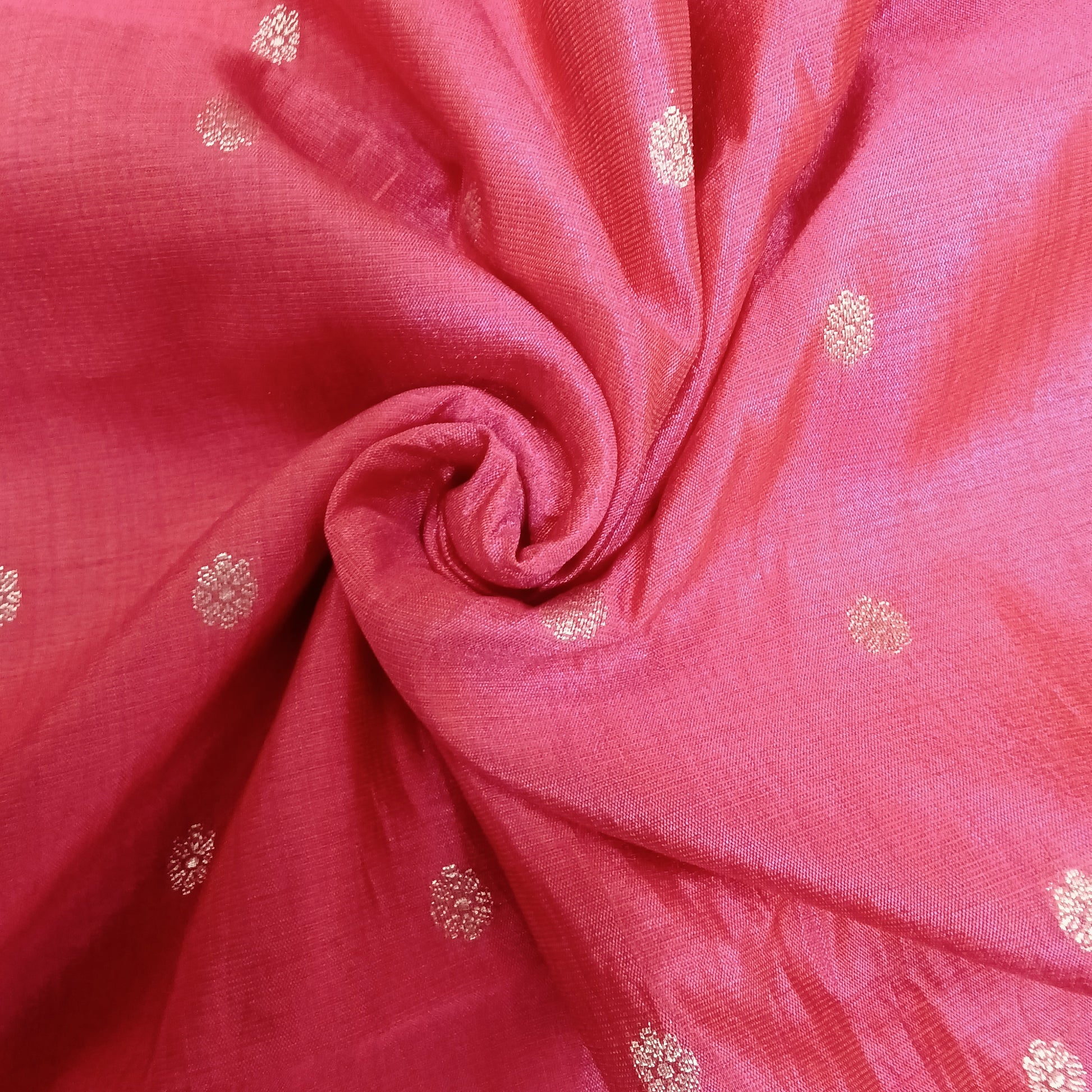 Design Detailing: This vibrant pink saree features intricate all-over woven buttas throughout the body. The self-colored border is elegantly highlighted with detailed silver zari work and a large paisley-like motif. Crafted from a fabric blend, likely cotton silk or semi raw silk, this piece is ideal for festive occasions.