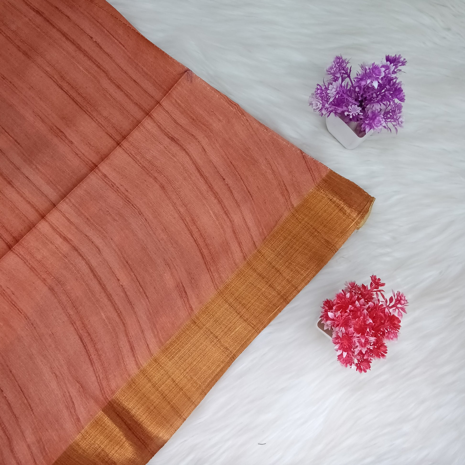 The top section is a bright yellow, transitioning to a light blue and then a pink section adorned with white polka dots. The lower border has a Rust Red, textured, wood-grain pattern and the pallu is finished with delicate tassels. The fabric is described as lightweight, soft, and comfortable for all-season wear.