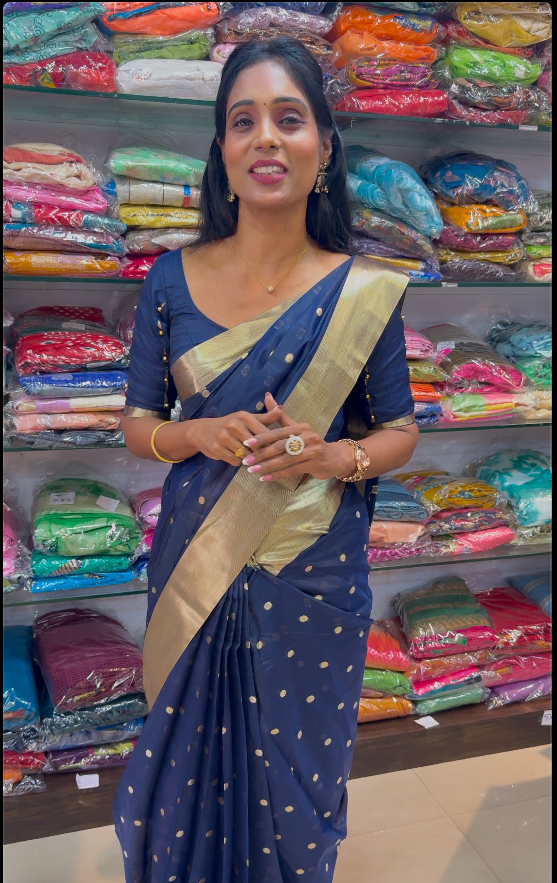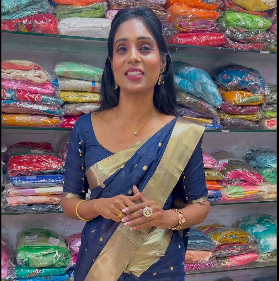 Work - This is a dark blue Nayanthara Inspired saree with small, golden polka dots. The saree features a wide, shimmering golden border at the bottom. Blue tassels adorn the edge of the saree, adding a playful detail. The fabric appears to be lightweight and has a subtle sheen.