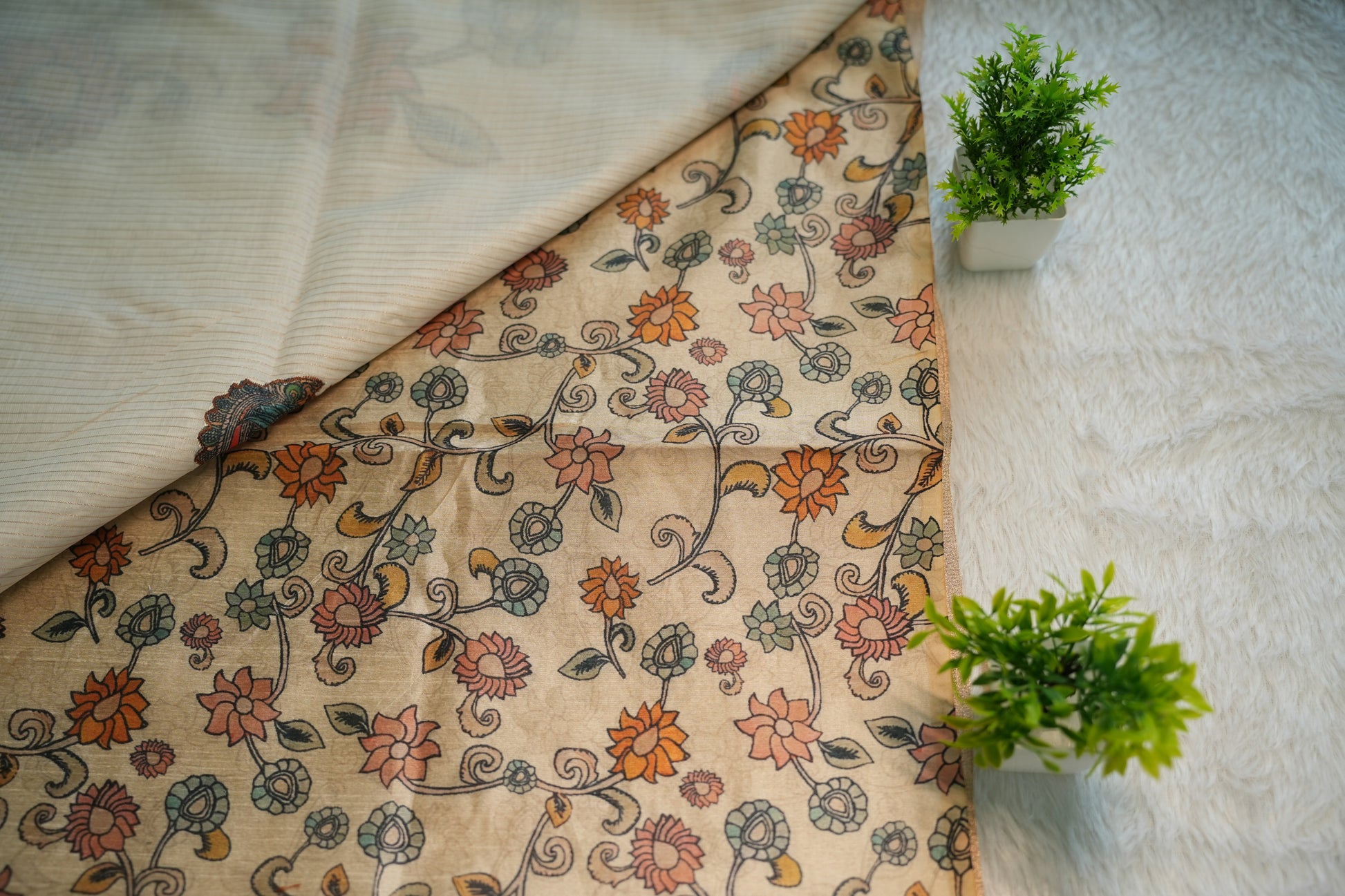 Design Detailing: This elegant saree features a light, possibly off-white or cream-colored base fabric. It is adorned with a vibrant floral pattern, showcasing large, artistic rose motifs in shades of orange, pink, and yellow. The design incorporates delicate outlines and subtle leaf details, giving it a contemporary yet classic appeal. The fabric appears to have a soft texture, possibly a blend suitable for comfortable draping.