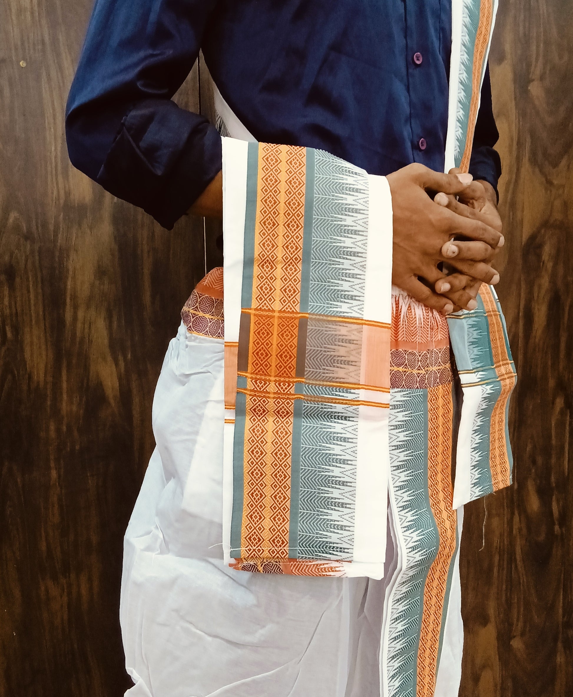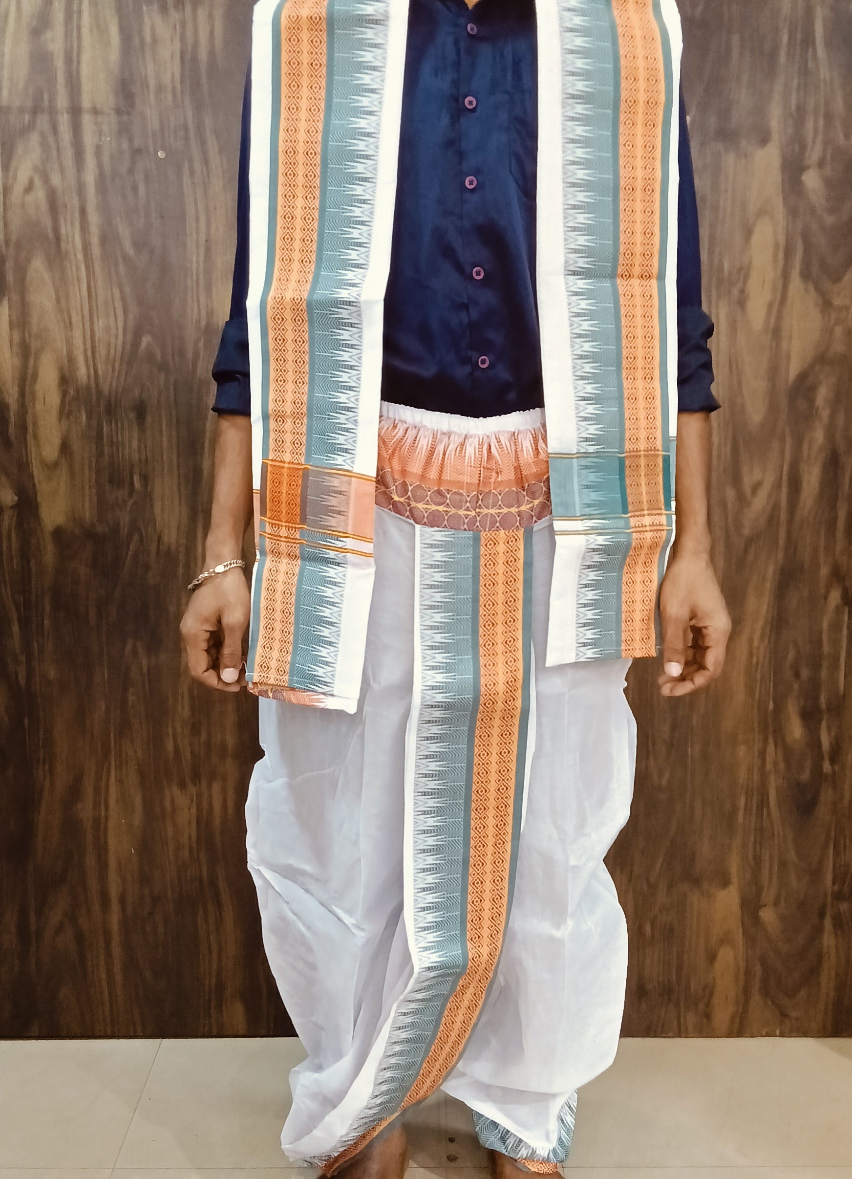 Design Detailing: The image displays a traditional Indian men's attire known as a Panchakacham with an Angavastram. The set is made of cotton fabric and features a white Panchakacham and a matching shawl-like Angavastram. Both pieces have prominent borders with Light Blue, Sandel detailing. This specific attire is commonly worn during formal and religious ceremonies, symbolizing adherence to tradition. Size Available in : 32 / 34 / 36 / 38