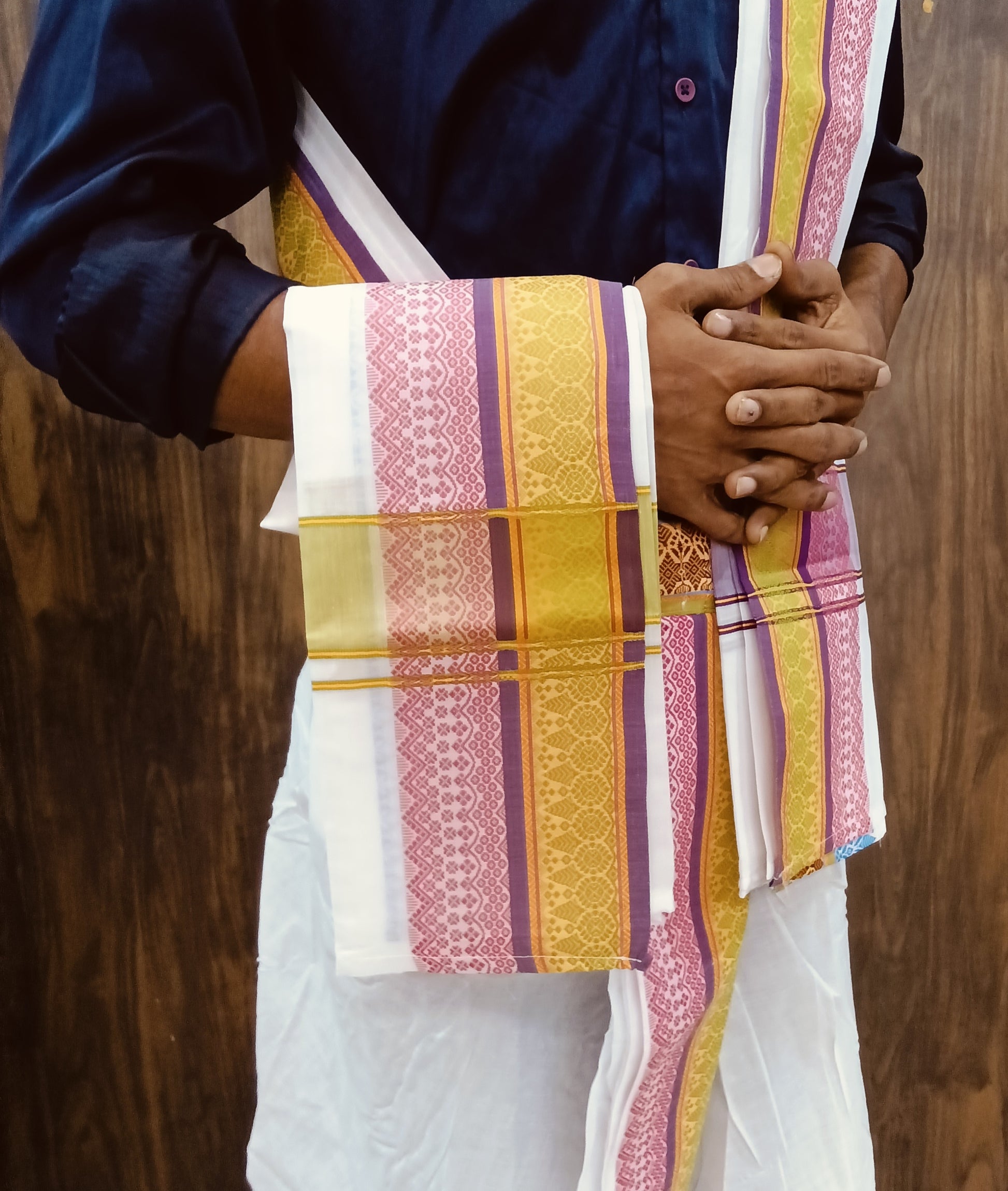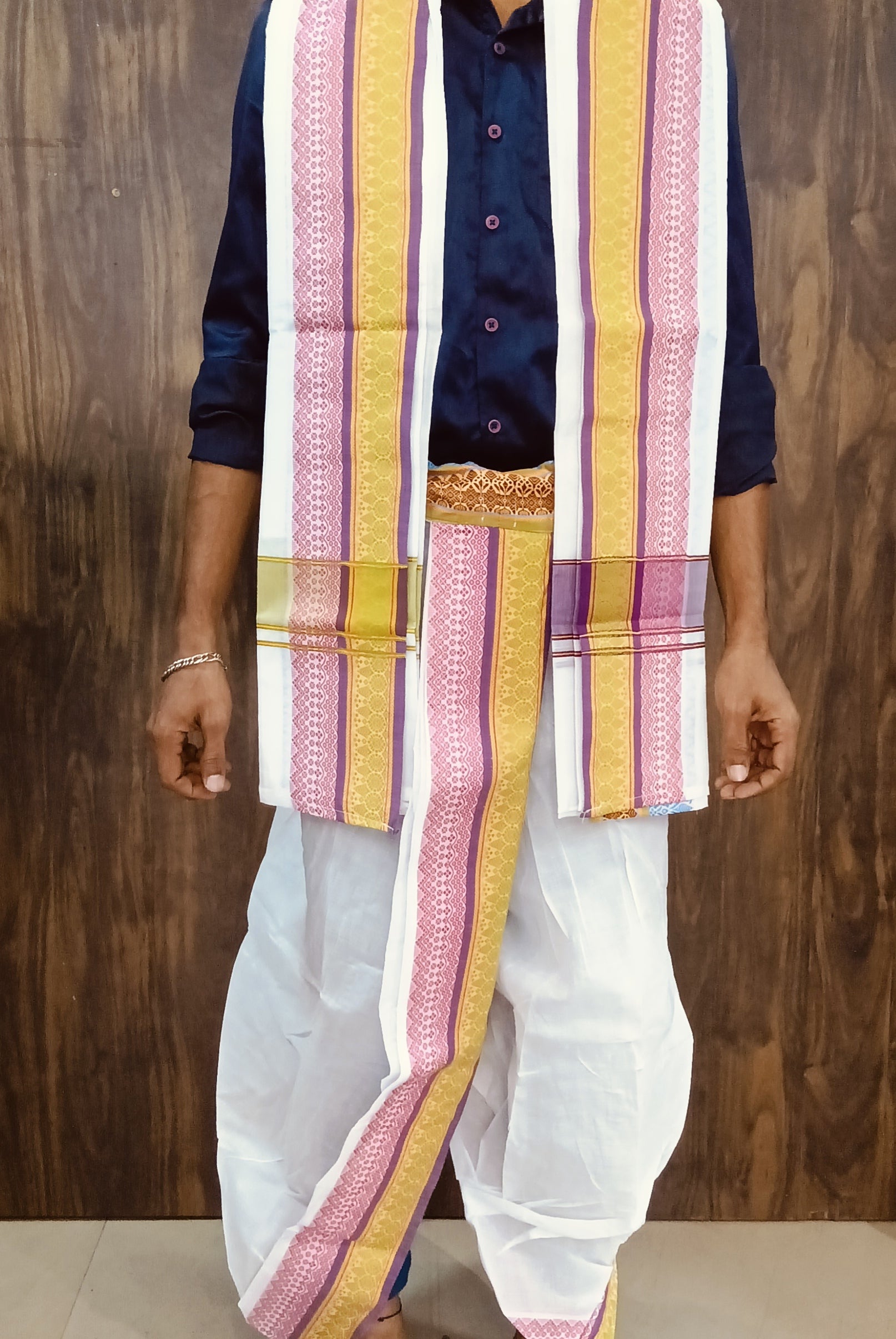 Design Detailing: The image displays a traditional Indian men's attire known as a Panchakacham with an Angavastram. The set is made of cotton fabric and features a white Panchakacham and a matching shawl-like Angavastram. Both pieces have prominent borders with mixed color detailing. This specific attire is commonly worn during formal and religious ceremonies, symbolizing adherence to tradition. Size Available in : 32 / 34 / 36 / 38