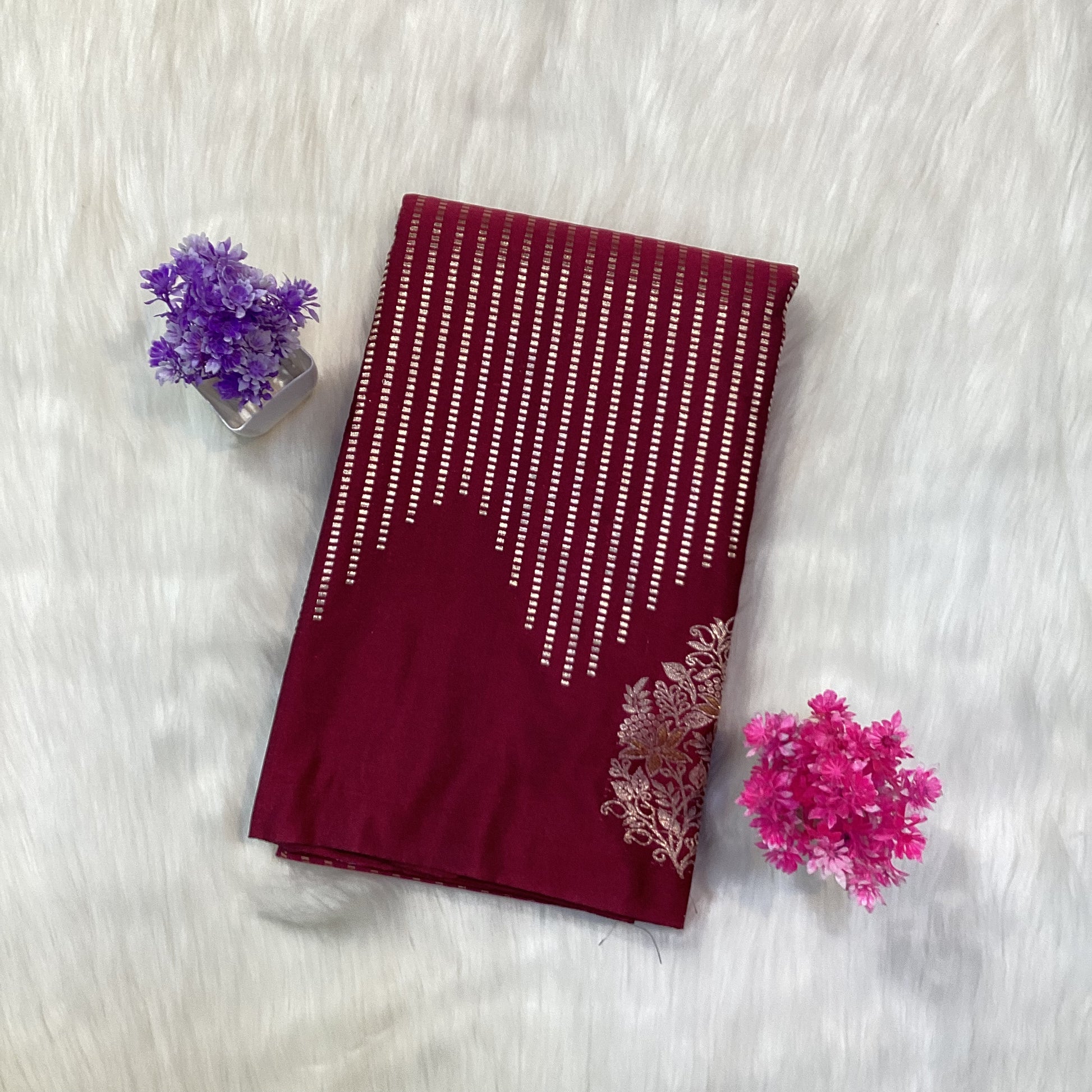 Design Detailing: This appears to be a Parampara Silk Saree, characterized by its traditional design and rich texture. It features a Marron body adorned with intricate gold zari work, including vertical stripes and a detailed floral motif on the pallu or border area. The design blends classic elegance with a contemporary aesthetic, making it suitable for various occasions. The saree showcases fine craftsmanship and a luxurious feel.