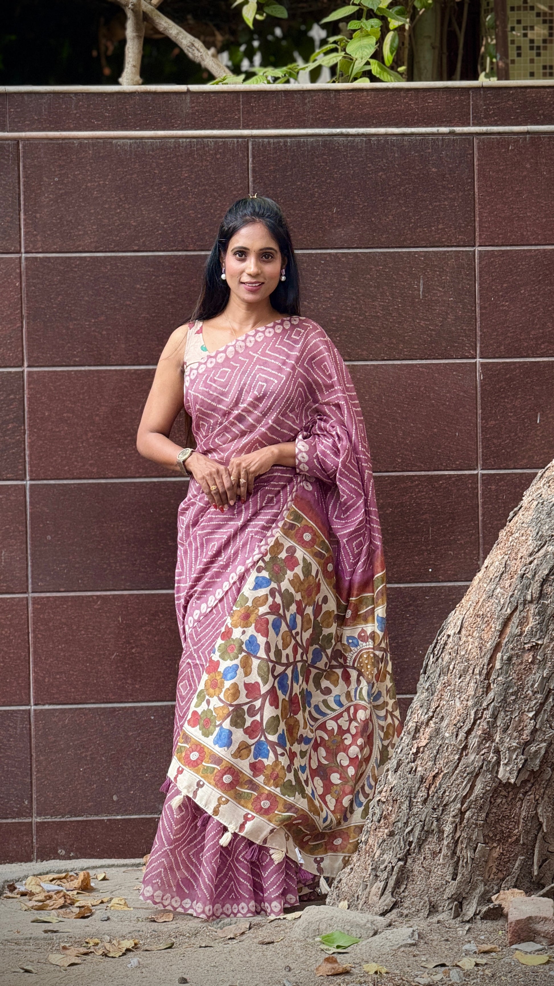 Design Detailing: This Summer Linen Silk Saree beautiful mauve-coloured saree. The main body of the saree has a subtle white geometric pattern, possibly a bandhani style print. The contrasting border and pallu are adorned with vibrant, multi-coloured Kalamkari-style floral and "tree of life" motifs. The fabric appears to be a comfortable cotton or cotton-silk blend, suitable for a casual or semi-formal look.