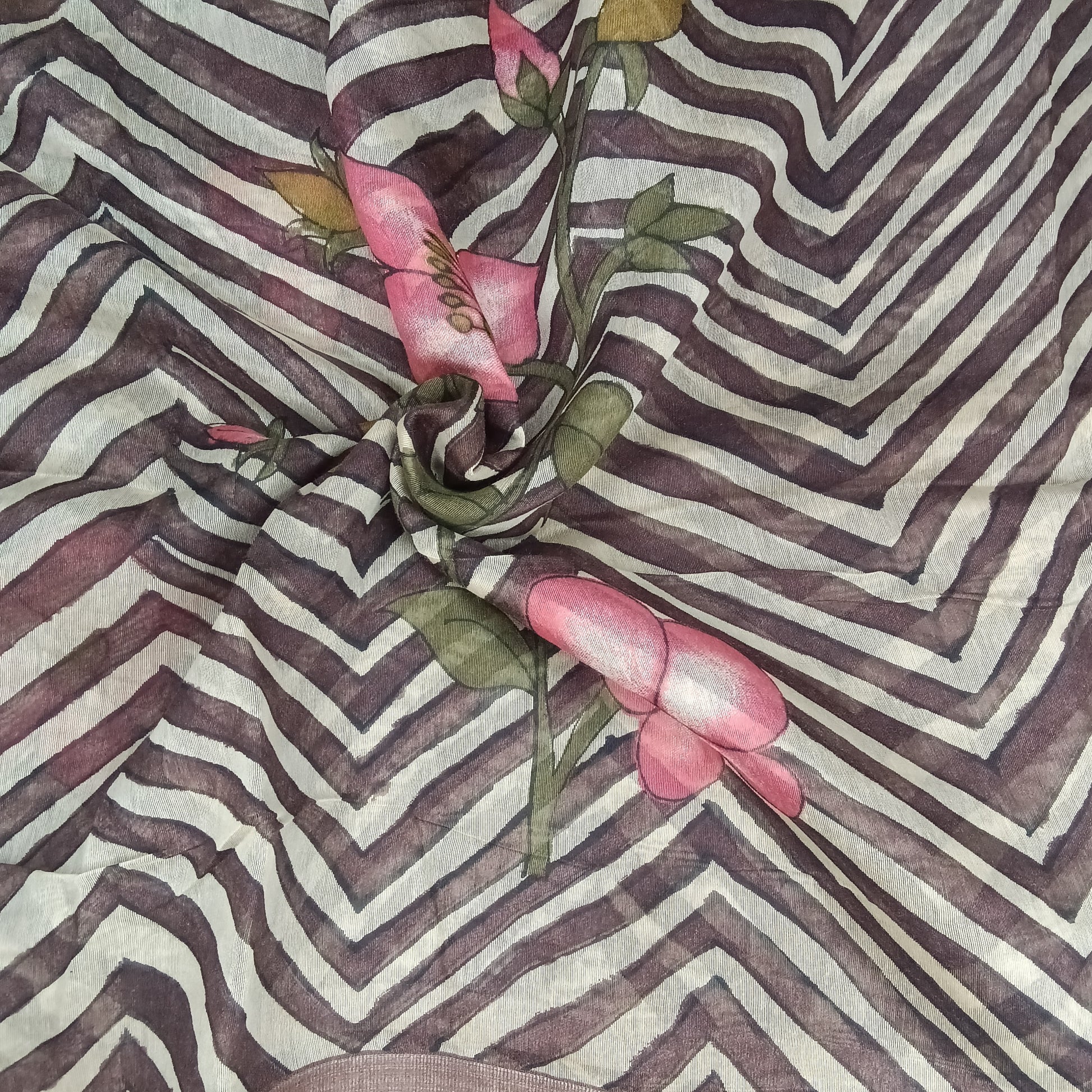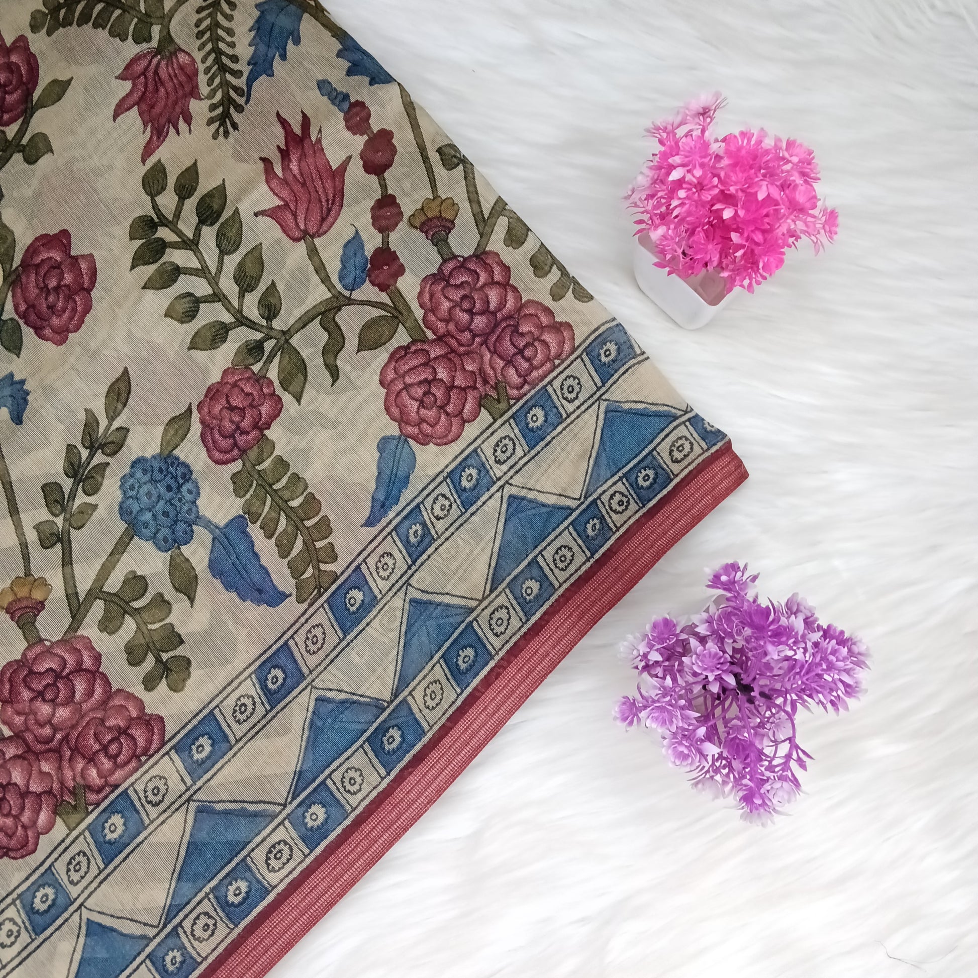 Design Detailing: This elegant siddhi saree is a traditional Indian garment with an off-white base color. It features a vibrant, all-over pattern of red and blue flowers and green leaves, possibly a form of Kalamkari or block print. The border has intricate blue geometric motifs, and the hem is finished with small decorative tassels. This type of handloom textile is a classic example of Indian craftsmanship and style.