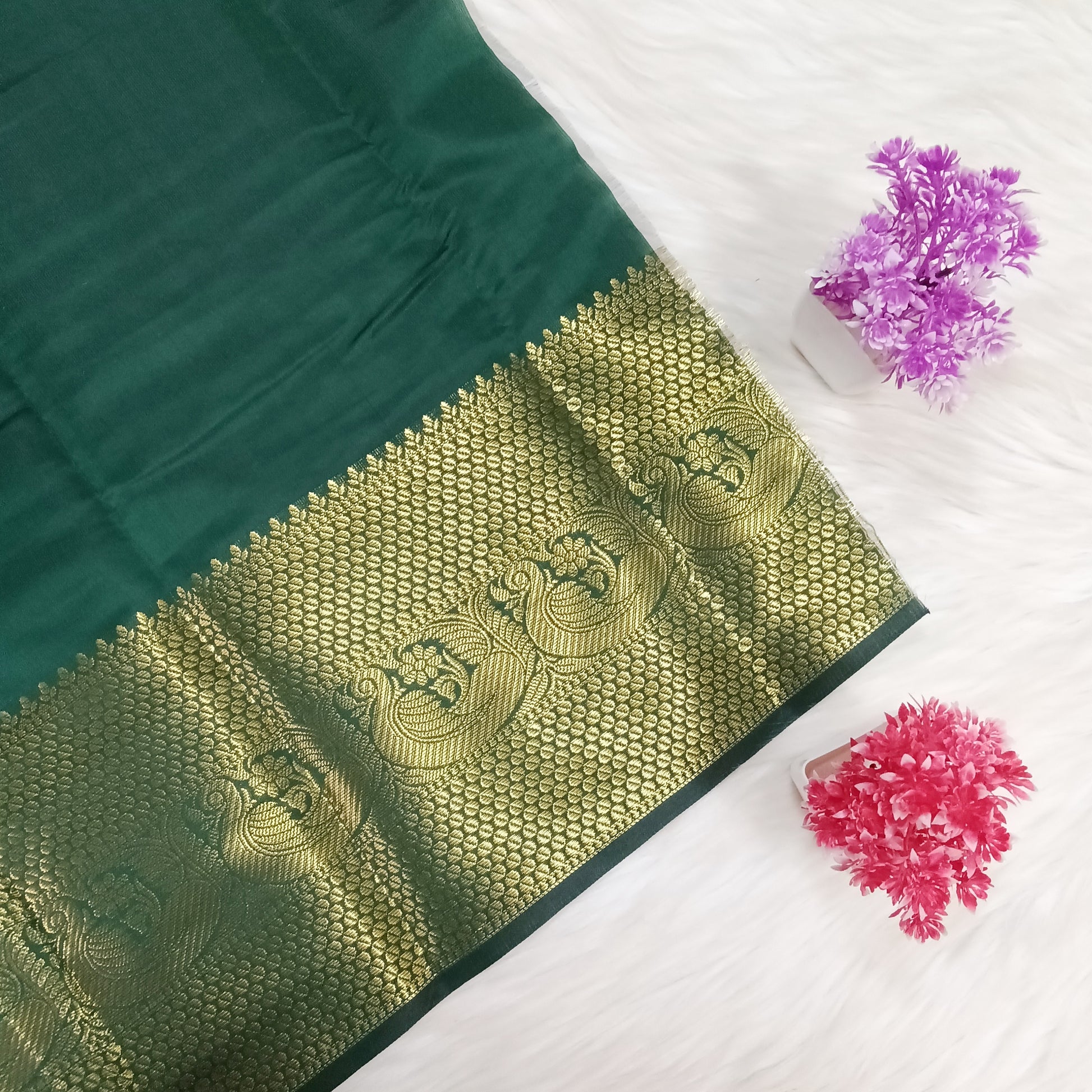 It features small gold and silver zari butta motifs across the body. The saree has a rich, broad gold zari border with traditional peacock designs. This elegant piece is ideal for weddings and festive occasions.