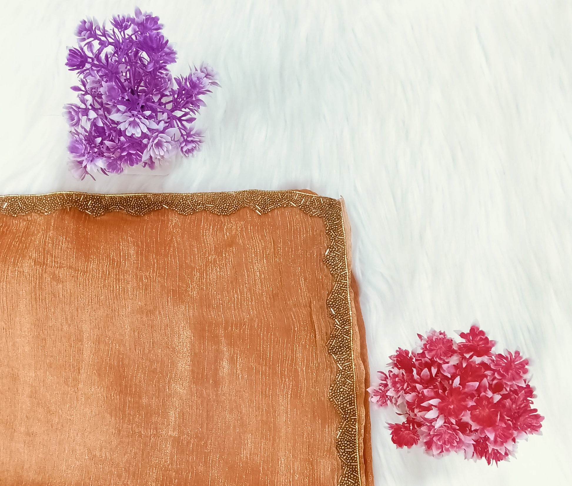 Design Detailing: This Peach color saree appears to be made from a light, flowy organza material. It features subtle embellishments, such as beads or sequin work, along the border. The fabric has a slight sheen and offers a chic, elegant, and playful appearance. This vibrant and modern piece is well-suited for festive events or parties.