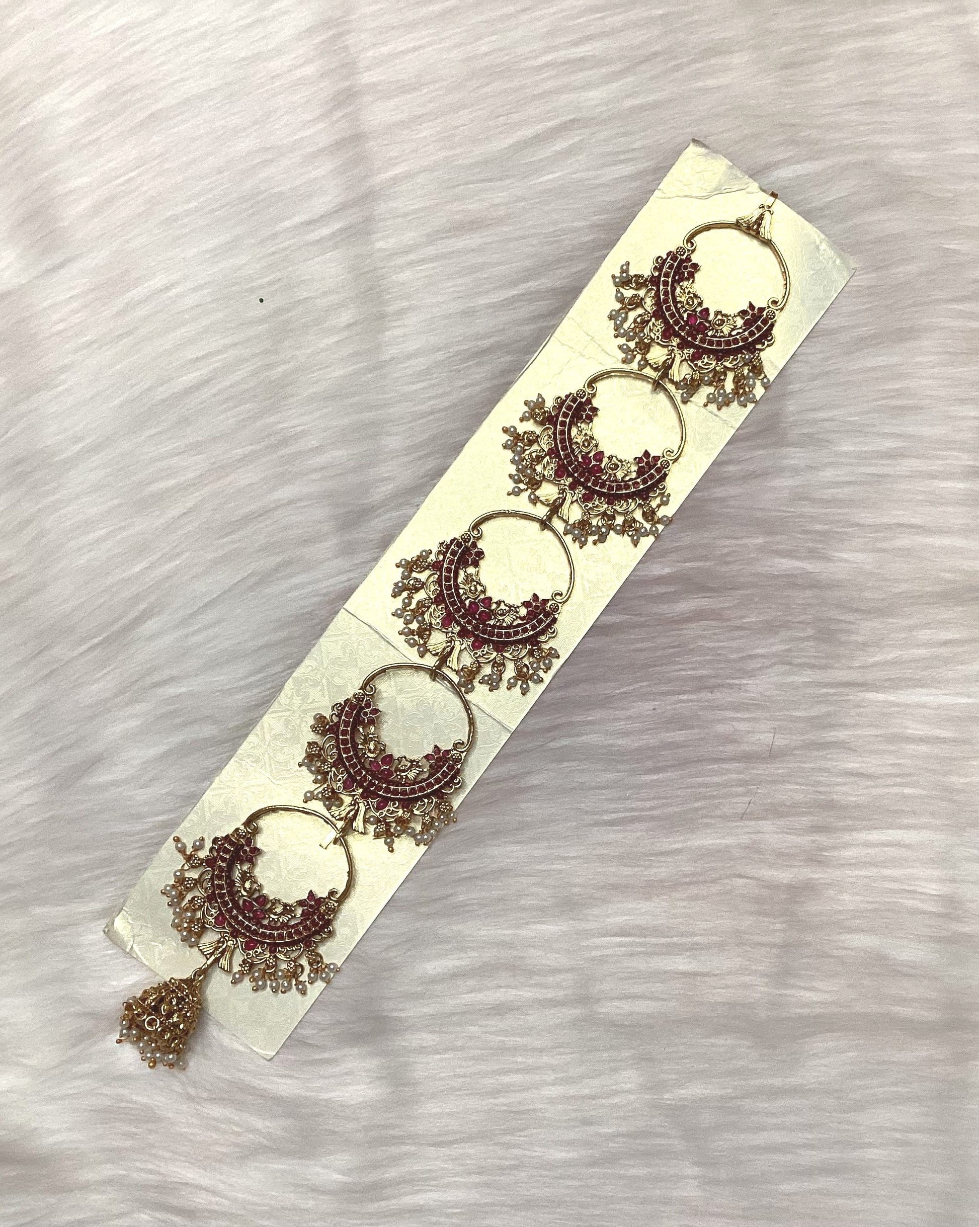 Design Detailing / Materials:- It is a type of hair ornament, typically worn by brides or for festive occasions, that adorns a braid or the length of the hair. It often features intricate designs, including kemp stones, pearls, or other embellishments, arranged in a cascading or linear pattern. This piece provides a traditional and ethnic look when paired with traditional attire.